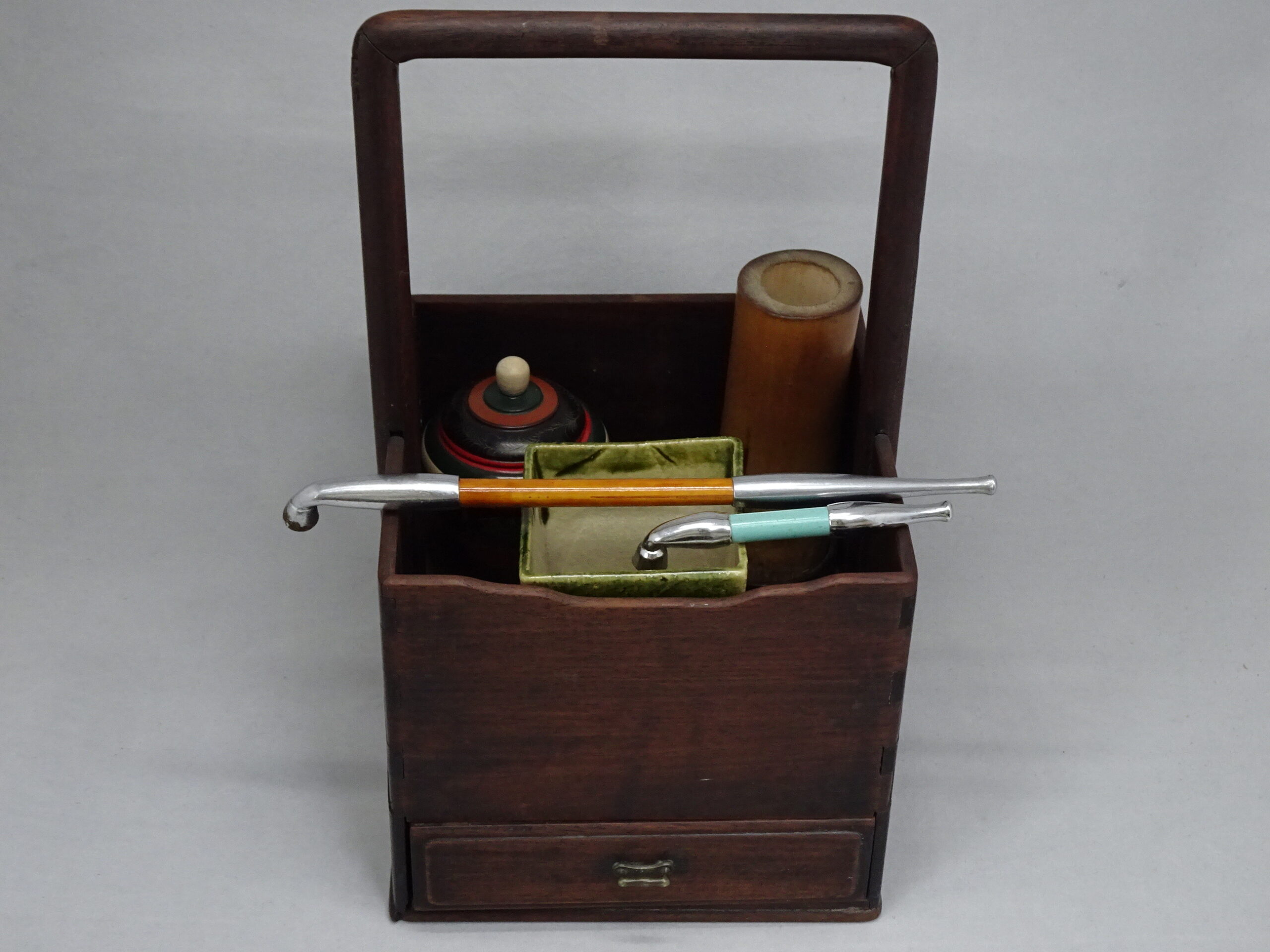 煙草盆は、火入、灰吹、煙草入、煙管、香箸など、喫煙具一式を納めておく道具。茶事においては、寄付、腰掛、席中では薄茶が始まる前に持ち出される。濃茶席と懐石中には出さない。また大寄せの茶会では、最初から正客の席に置かれる。